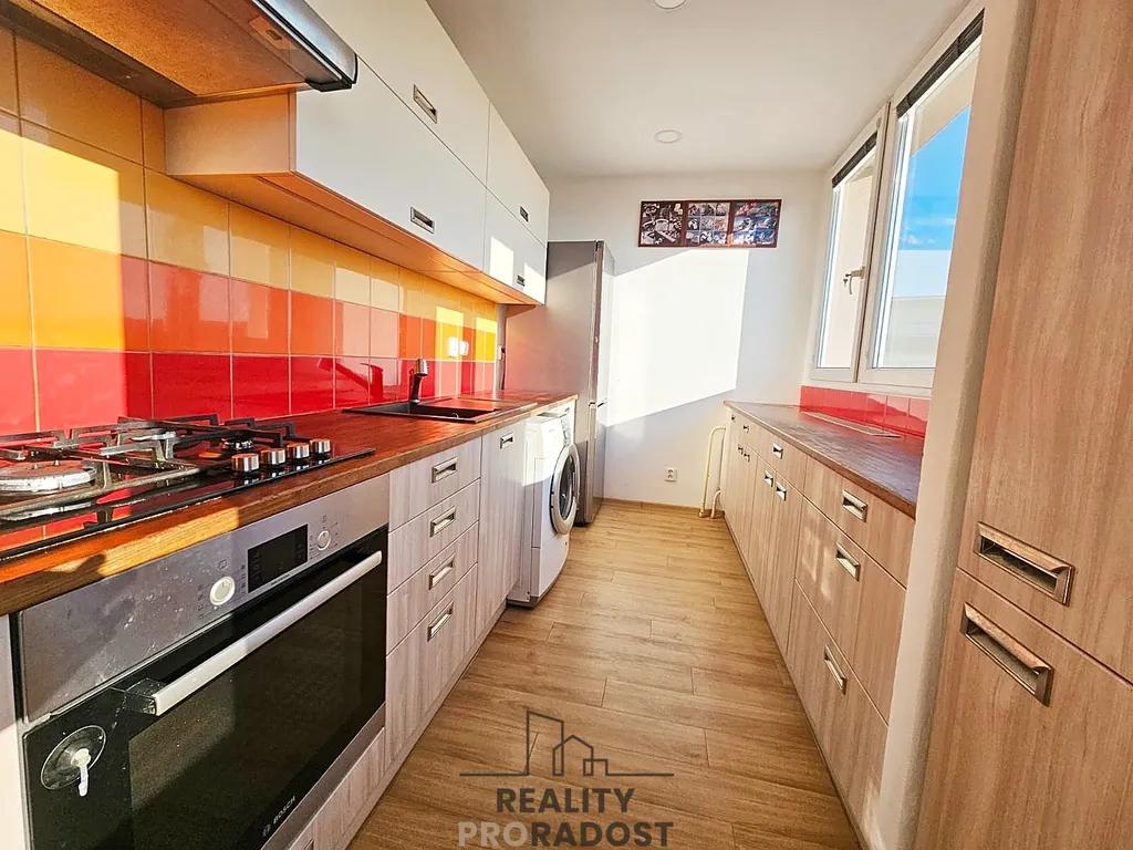 Bytové jádro je zděné, podlahy v ložnicích parkety, v předsíni a bytovém jádře dlažby, v ostatních místnostech vinyl. V kuchyni se nachází kuchyňská linka s vestavěnou plynovou varnou deskou, troubou, digestoří, myčkou nádobí, pračkou a ledničkou. V obývacím pokoji se nachází jídelní stůl a židle, knihovna, sedačka, konferenční stolek a obývací stěna. V ložnici se zaskleným balkonem je prostorná vestavěná šatní skříň, dvoulůžková postel s roštem bez matrace a dva noční stolky, v dětském pokoji šatní skříň. Další vestavěná skříň je v předsíni. Dům je zateplený, po kompletní opravě. Orientace bytu V-Z.