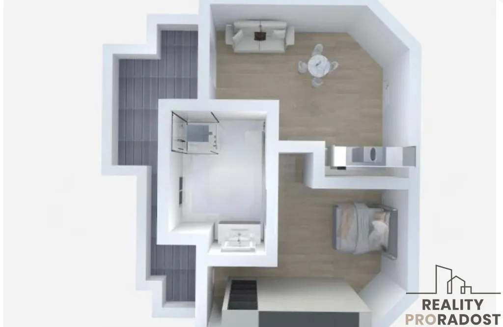 Noční část tvoří útulná ložnice s manželskou postelí a koupelna s oknem, která zajišťuje dostatek denního světla i přirozené větrání.