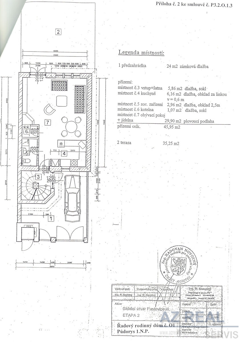 Přízemí: předsíň, spodní koupelna se sprchovým koutem a WC, spíž, kuchyň oddělená barem od jídelny a prostorného obývacího pokoje se vstupem na zastřešenou terasu ideální pro celoroční posezení a upravenou zahrádku.