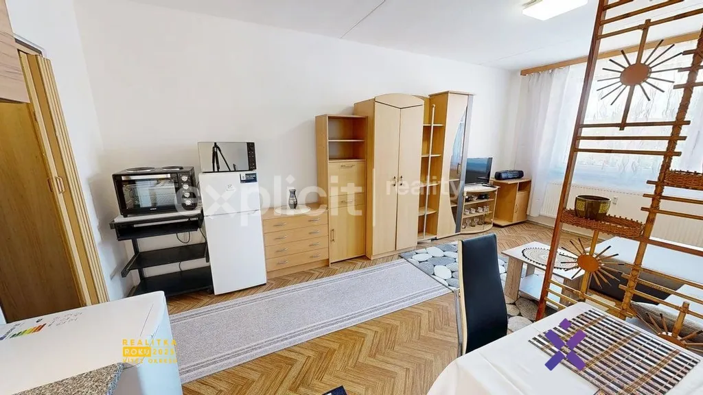 Interiér bytu tvoří prostorný pokoj s kuchyňskou částí vybavenou kuchyňskou linkou, dvouplotýnkovým vařičem, lednicí, mikrovlnnou troubou i jídelním koutem. V obývací části je pohodlná rozkládací sedačka, konferenční stolek, TV, skříně a další nábytek poskytující dostatek úložného prostoru. V předsíni se nachází šatní stěna s velkým zrcadlem a úložná skříň. Koupelna je prakticky řešená s vanou, umyvadlem a toaletou. Byt je velmi dobře dispozičně řešený a díky své orientaci na jihovýchod působí příjemně a vzdušně.