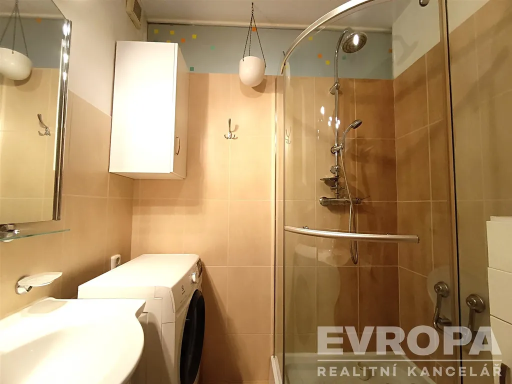 Dispozice bytu: ložnice, obývací pokoj, kuchyň, koupelna se sprchovým koutem, samostatná toaleta. K bytu náleží sklepní kóje. Bytová jednotka je nabízena k pronájmu téměř plně vybavená (viz. foto). Kuchyňská linka je rovněž vybavena všemi obvyklými spotřebiči (plynový sporák s troubou, myčka, lednice + mrazák, mikrovlnná trouba). V koupelně je k dispozici zánovní pračka.