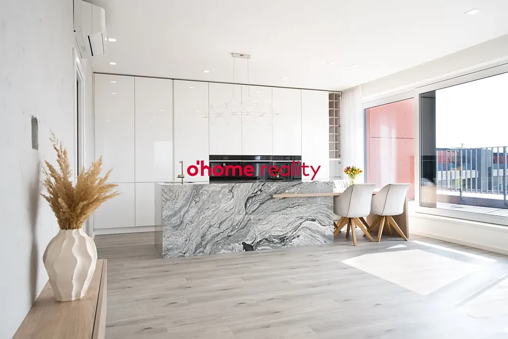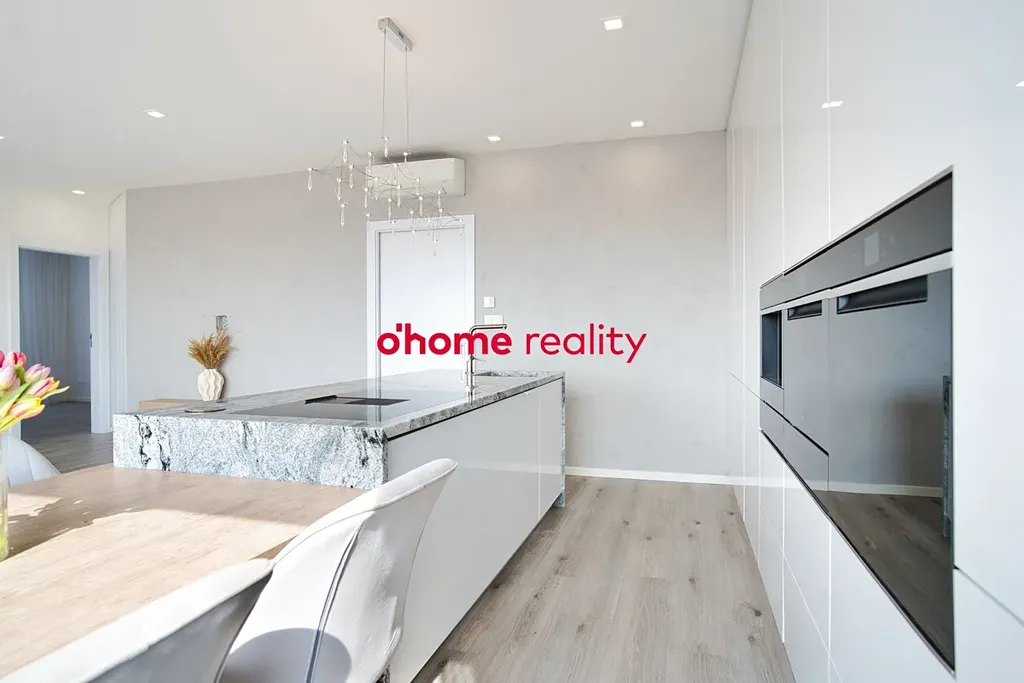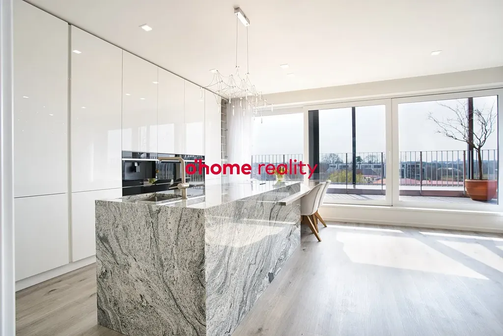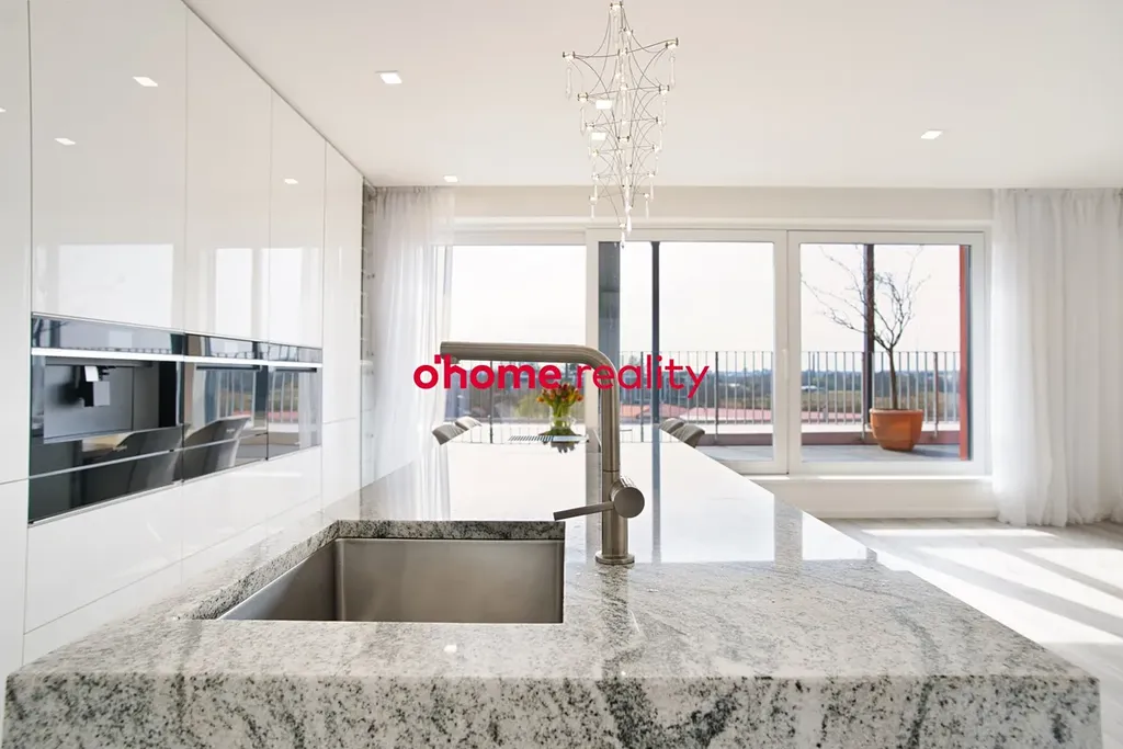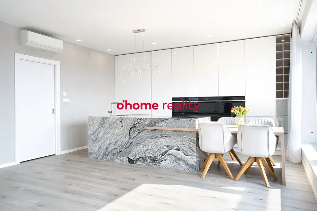 Kuchyňská část představuje skutečné designové i funkční centrum bytu. Dominantní ostrůvek z pravé žuly podtrhuje exkluzivní charakter prostoru. Veškeré spotřebiče jsou značky Whirlpool, včetně vestavěného kávovaru s technologií Jura. Nechybí dvě vestavěné lednice a nábytek na míru s precizně integrovaným osvětlením.