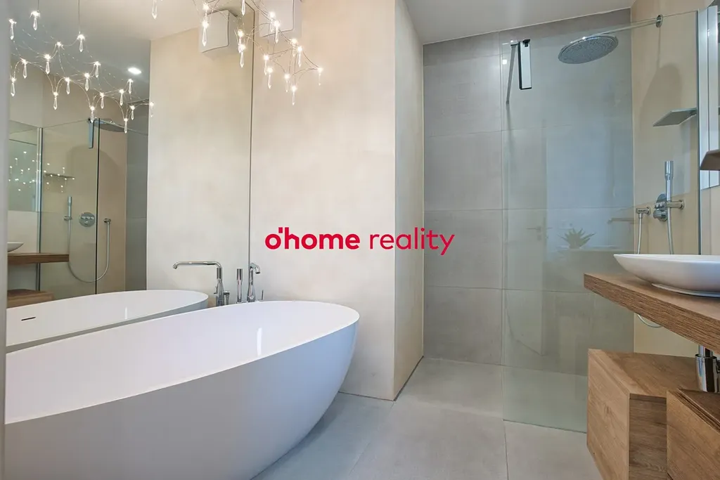 Koupelna je řešena jako privátní wellness zóna – vana z litého mramoru, umyvadlo Villeroy & Bosch a armatury Grohe podtrhují vysoký standard a nadčasovou eleganci.