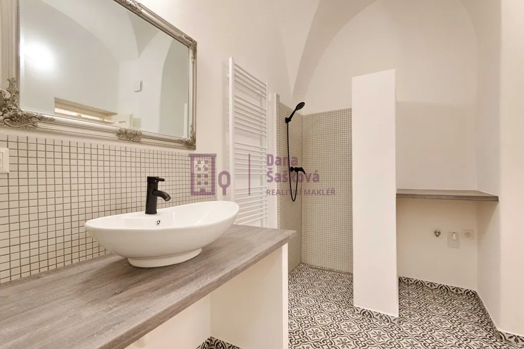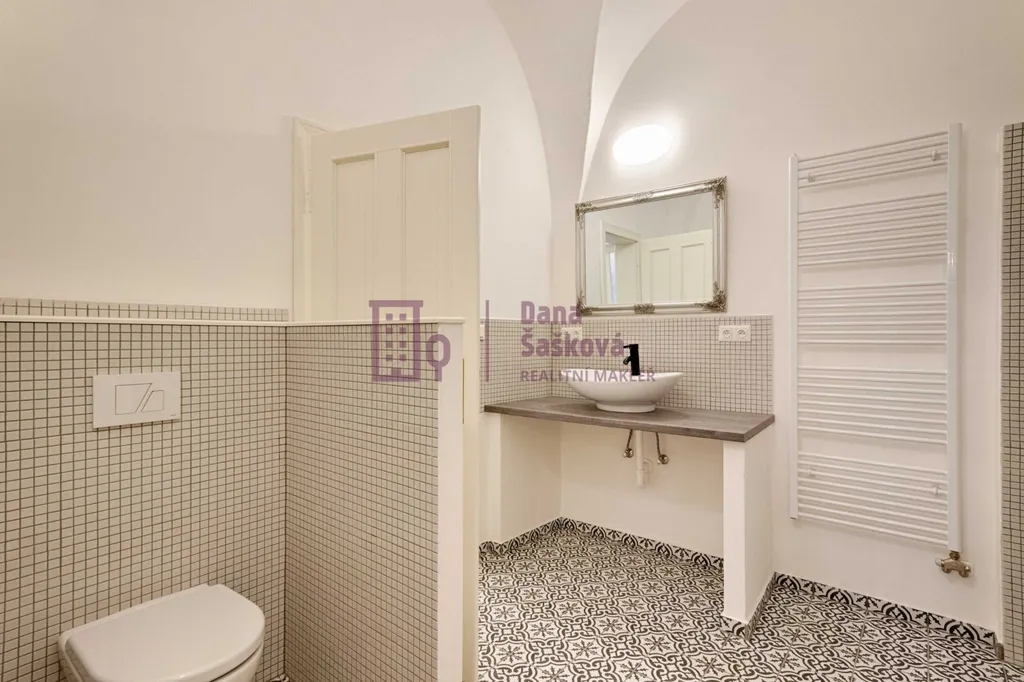 Dominantou celého prostoru jsou původní, více jak dva metry vysoká kachlová kamna, která dodávají bytu jedinečný a nezaměnitelný charakter.