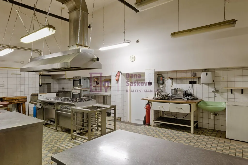 Kuchyně je vybavená plynovými sporáky, konvektomatem, digestoří, grilem, myčkou nádobí, fritézou, kráječi a nádobím.
