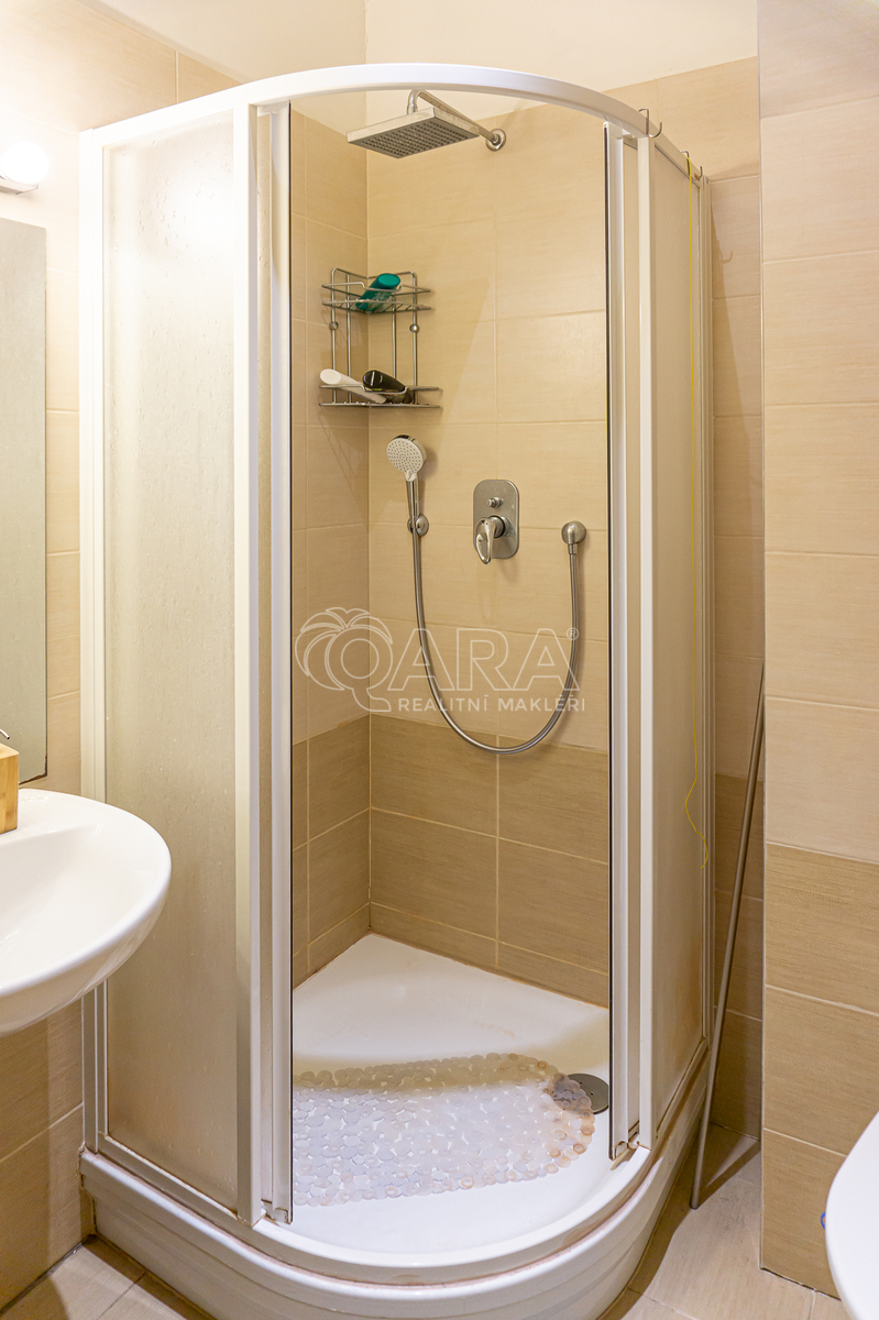 Kuchyňská linka je vybavena varnou deskou, digestoří, mikrovlnnou troubou a ledničkou. Koupelna je se sprchovým koutem, WC a pračkou. Dostatek úložného prostoru poskytují vestavěná skříň v předsíni a obývací stěna. Ohřev vody je zajištěn elektrickým bojlerem, topení elektrickými přímotopy.