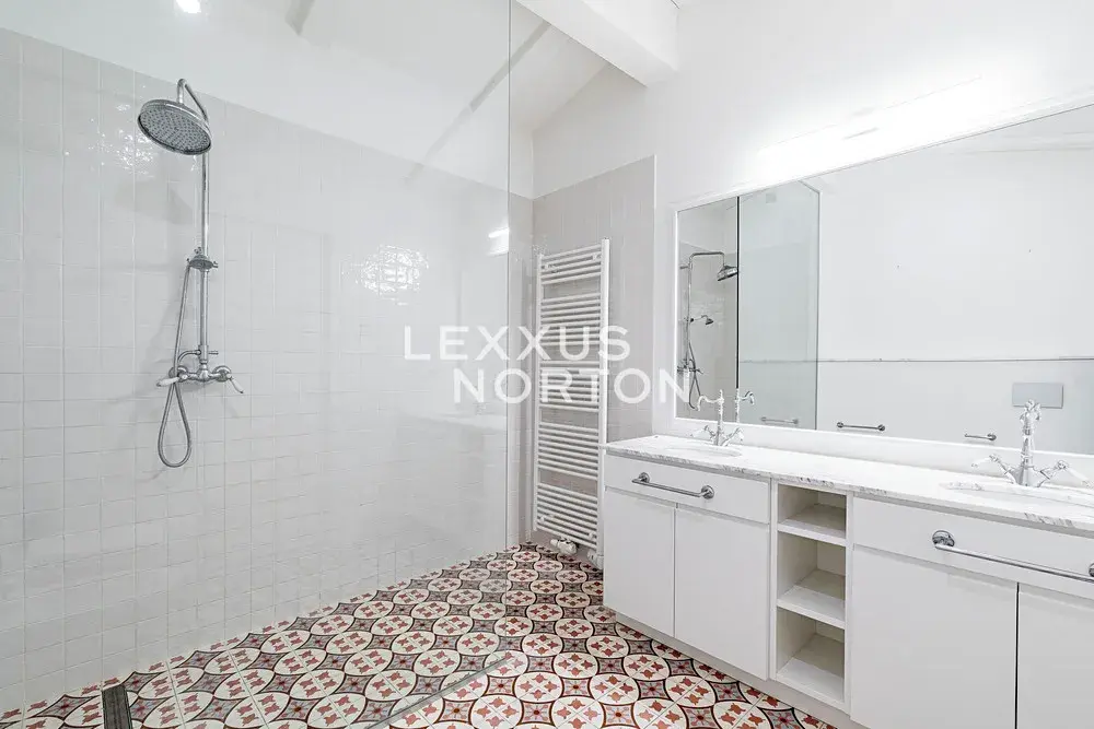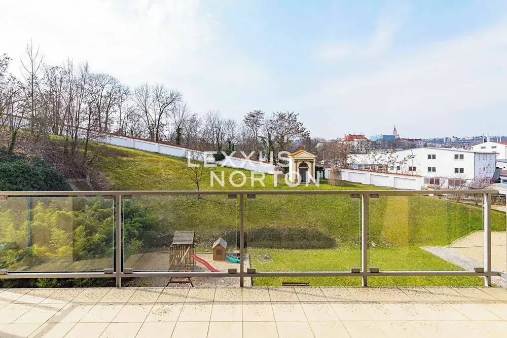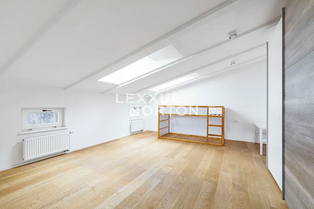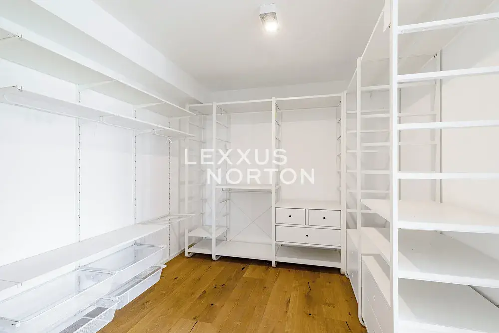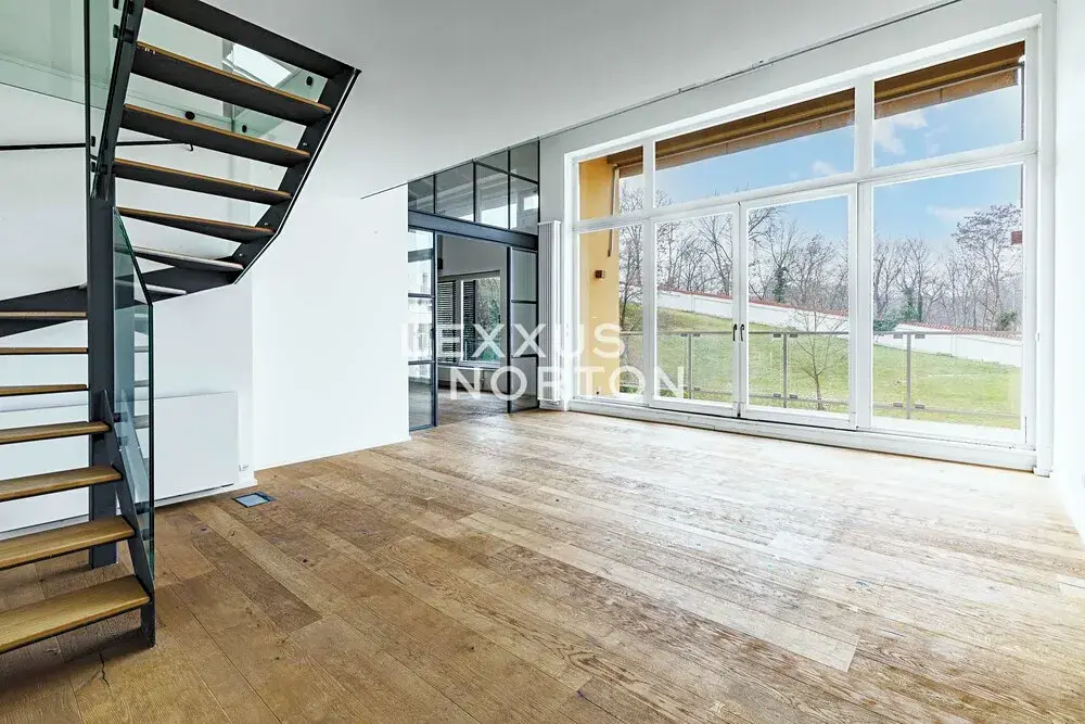 Ve spodním patře se nachází obývací pokoj propojený s kuchyní a vstupem na terasu orientovanou do klidného, soukromého vnitrobloku. Dále jsou zde dvě ložnice s vlastními koupelnami a šatnami. Horní patro mezonetu nabízí dvě samostatné galerie, dvě koupelny a tři ložnice.