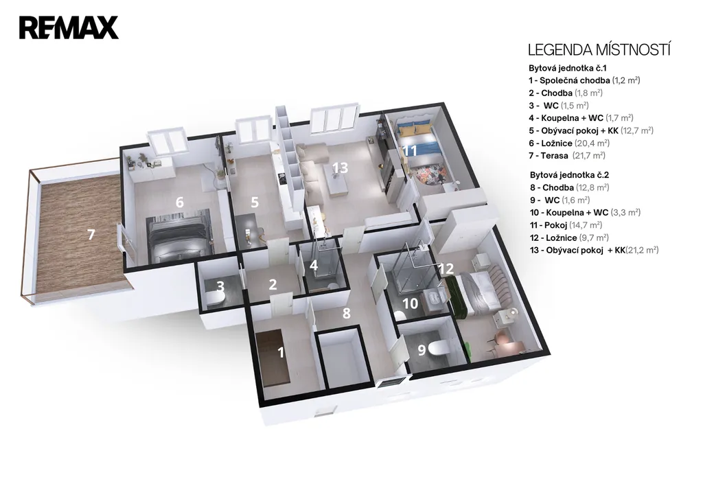 Dům disponuje třemi samostatnými bytovými jednotkami, což přináší široké možnosti využití. Je vhodný jak pro vícegenerační bydlení, tak i pro kombinaci vlastního bydlení s pronájmem jednotlivých bytů.