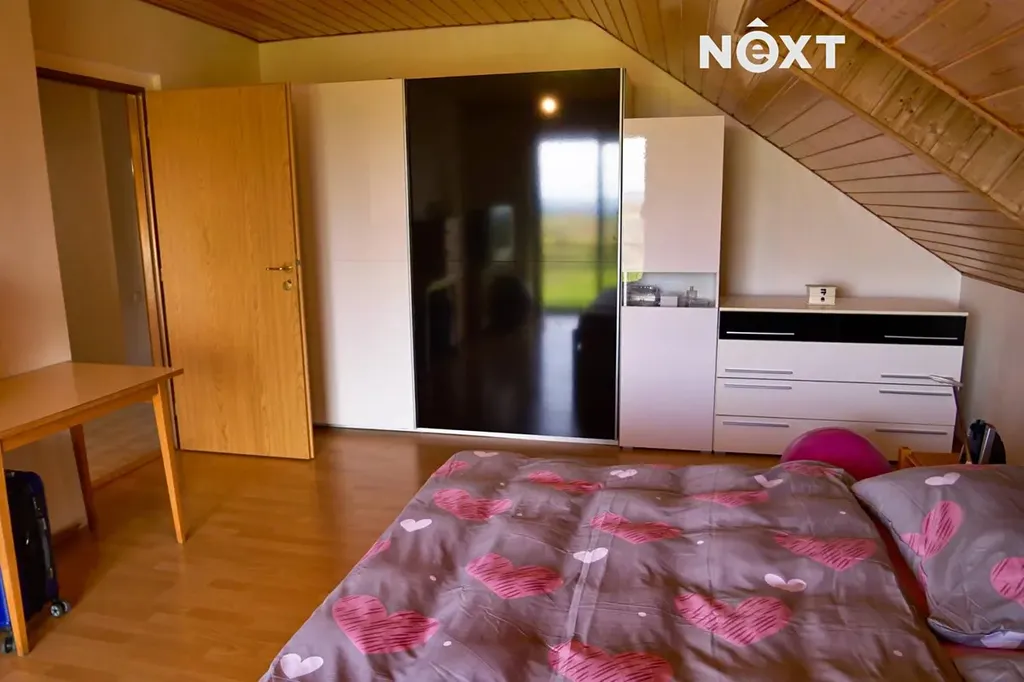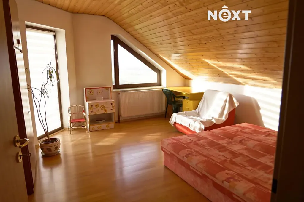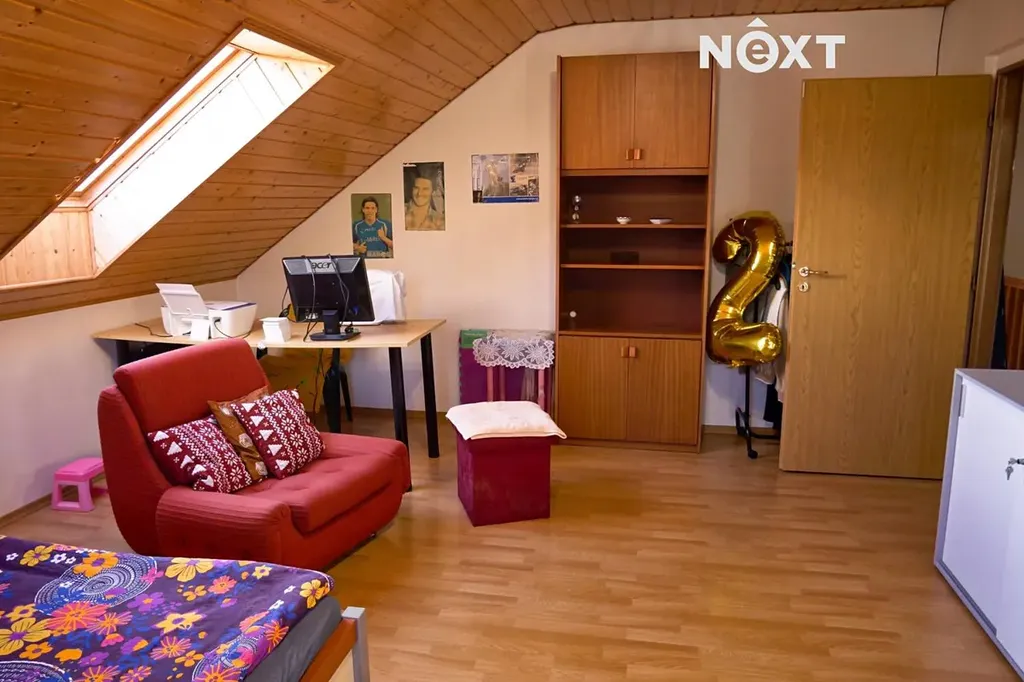 Podkroví: dřevěné schodiště s chodbou kterou se vstupuje do jednotlivých pokojů – ložnice s balkonem cca 23 m2 a dvou dětských pokojů cca 18 m2 a 21 m2, dále prostorná koupelna s WC, rohovou vanou a umyvadlem, je zde volný prostor třeba pro domácí saunu.