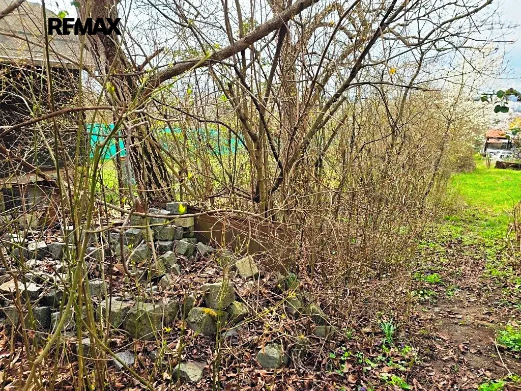 Historický objekt: Na pozemku stojí bouda. Tedy, říkejme tomu bouda – je v takovém stavu, že ji nejspíš shodíte silnějším kýchnutím. Ideální šance postavit si něco, co vám nespadne na hlavu.