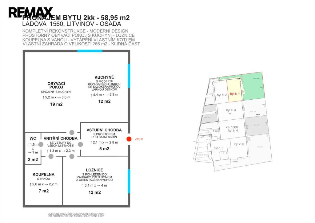 Byt č.1 - přízemí s vlastním vstupem, dispozice 2+kk, podlahová plocha 58,95 m2, zahrada 266 m2, sklep 13,30 m2, parkovací místo. Orientace oken na východ/sever.