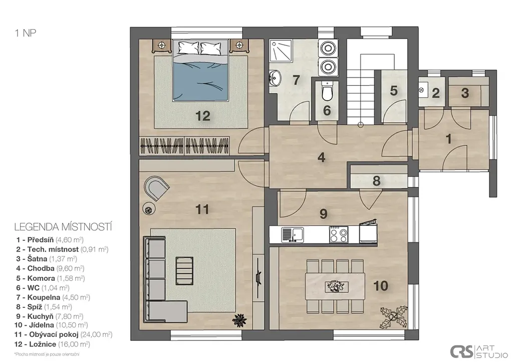 1.NP – zvýšené přízemí domu má dispozici 2+1 s velkou vstupní halou, a samostatnou koupelnou a wc. Výměra 83,5 m2. Schodiště v zadní části domu vede do sklepa a zároveň do 2. nadzemního podlaží.