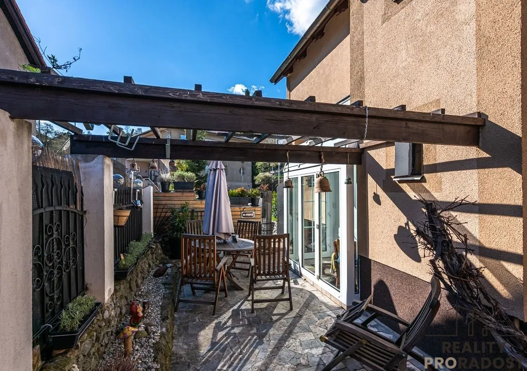 Vytápění domu je zajištěno tepelným čerpadlem. Dům je zateplený a má novou fasádu. Bezpečí domu je zajištěno zařízením Jablotron a nabízí i vysoce kvalitní Internetové připojení. Zahrada disponuje na jižní straně zakrytou pergolou s posezením, novou vířivkou a dřevěnou boudou se skladovacími prostory, na severní straně - letním posezením s grilem.