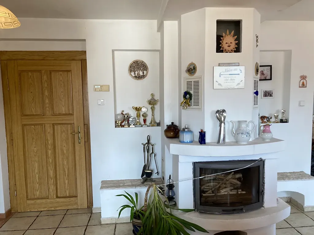 Obývací pokoj s krbem je propojen s jídelní a kuchyňskou částí tak, jak je vidět na fotkách.