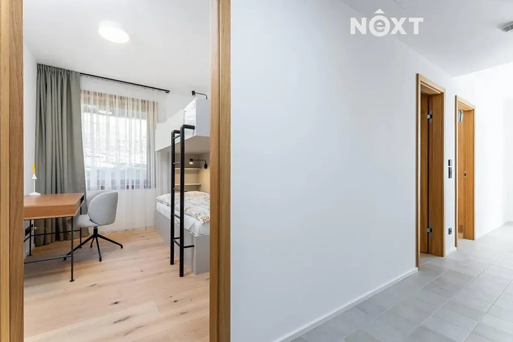 Dispozice nabízí světlý obývací prostor s kuchyní na míru a dvě samostatné místnosti, které lze využít jako ložnici, dětský pokoj nebo pracovnu. Je to prostor, kde lze pohodlně kombinovat rodinný život i práci na dálku – bez kompromisů.