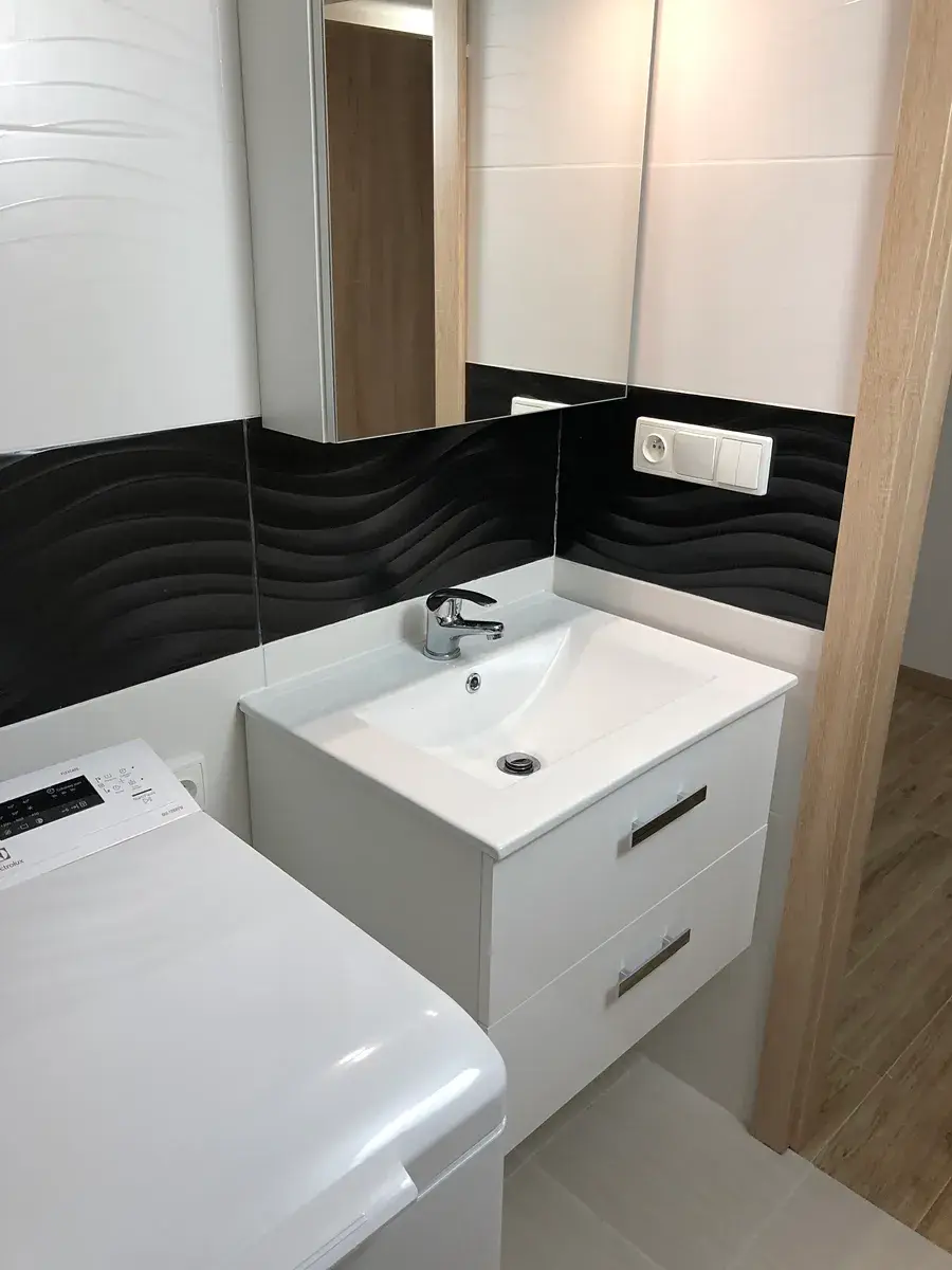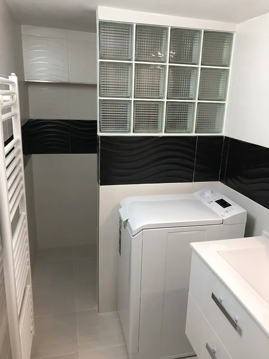Dispozice a vybavení bytu: Kuchyňský kout se spotřebiči (velká lednice s mrazákem, varná deska, mikrovlnná trouba), dále pohovka, stůl + 2 židle, skříň. V ložnici manželská postel s kvalitní matrací, přikrývkami, polštáři a povlečením. Koupelna se sprchovým koutem, pračkou a wc.