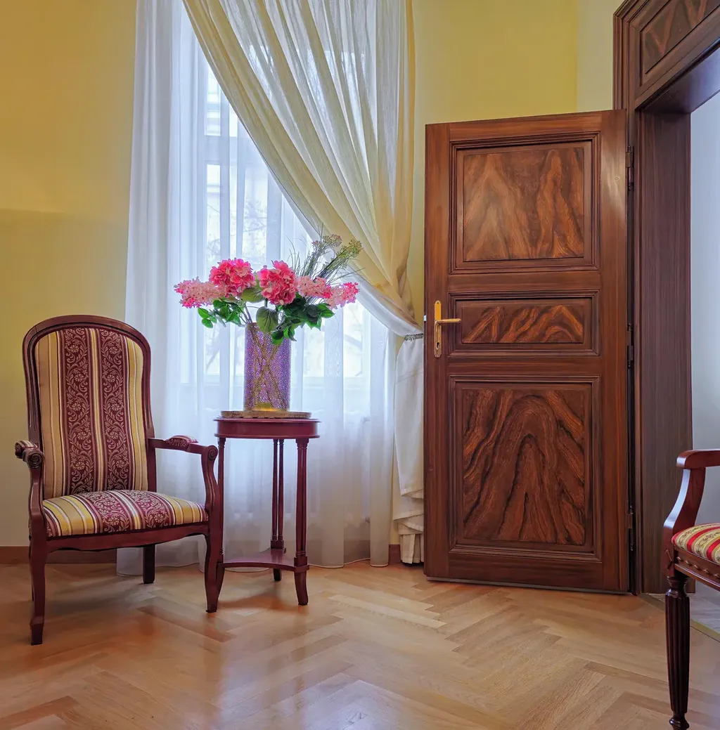 Interiér bytu je důkazem sofistikovaného architektonického přístupu, kde moderní design harmonicky splývá s autentickými prvkami, včetně precizně zpracovaných replik špaletových oken, dřevěných parapetů a pečlivě renovovaných dveří. Kompletní rekonstrukce bytu zahrnovala instalaci kvalitních dřevěných parket a keramické dlažby, na míru vyrobenou kuchyň s moderními spotřebiči, integrovanou pračkou a bezpečně umístěným plynovým kotlem.