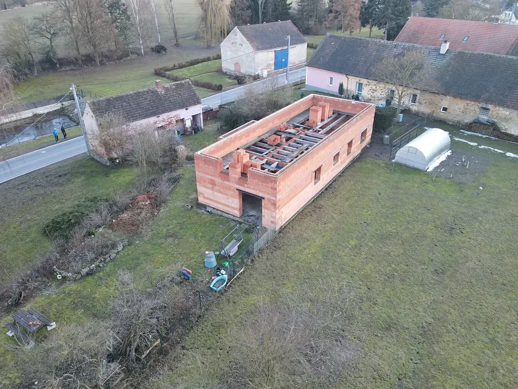 Na stavbě je provedena základová deska s prvním nadzemním podlažím z cihel o tl.44cm. Dále jsou položeny dřevěné trámy a vyneseny palety s materiálem na druhé nadzemní podlaží. V druhé podlaží je příprava na druhý věnec.
