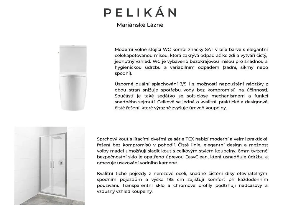 Jednotka je částečně zařízená a připravena k okamžitému užívání – součástí je nová kuchyňská linka a nadstandardně provedená koupelna. Koncept Nájemního domu Pelikán je postaven na dlouhodobém pronájmu, kvalitní správě a stabilním bydlení. Projekt reaguje na dlouhodobý nedostatek dostupných nájemních bytů v regionu a klade důraz na komfort, funkčnost a dlouhodobou udržitelnost bydlení.