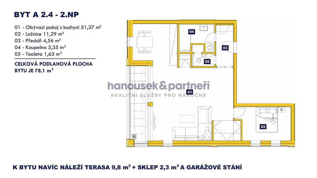Nabízím vám byt s dispozicí 2+kk o velikosti 78,1 m2. V bytě je obývací pokoj s kuchyní, ložnice, předsíň, koupelna se sprchovým koutem a samostatné WC. Nachází se ve 2. patře domu A a navíc k němu patří terasa s výměrou 9,8 m2, sklep a garážové stání.