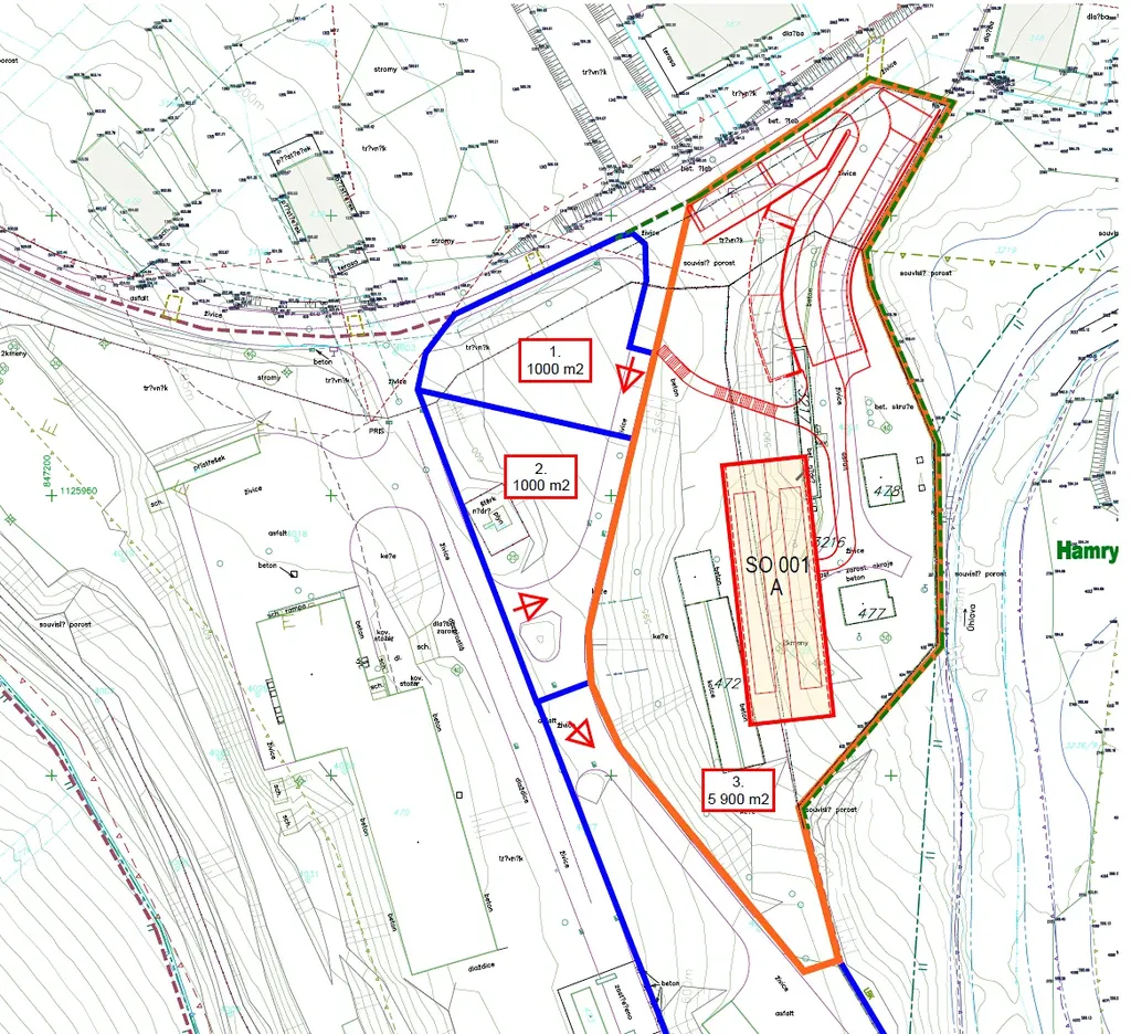 Celková plocha děleného pozemku je 5 900m2. Pozemek se prodává včetně projektu objektu k rekraci - apartmány.