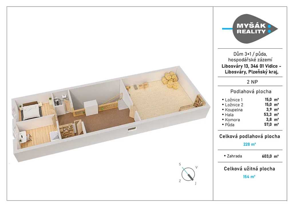 V přízemí se nachází dispozice 1+1+hala – obývací pokoj, samostatná kuchyň, koupelna s vanou, samostatné WC, hala se schodištěm do patra a technická místnost. První patro nabízí halu, dva pokoje, koupelnu se sprchovým koutem a WC a menší skladovací prostor. Významnou část tohoto podlaží tvoří půda, která je zatím v syrovém stavu, ale nabízí velký potenciál pro rozšíření obytné plochy, vytvoření dalších pokojů, pracovny nebo třeba samostatné části pro hosty.