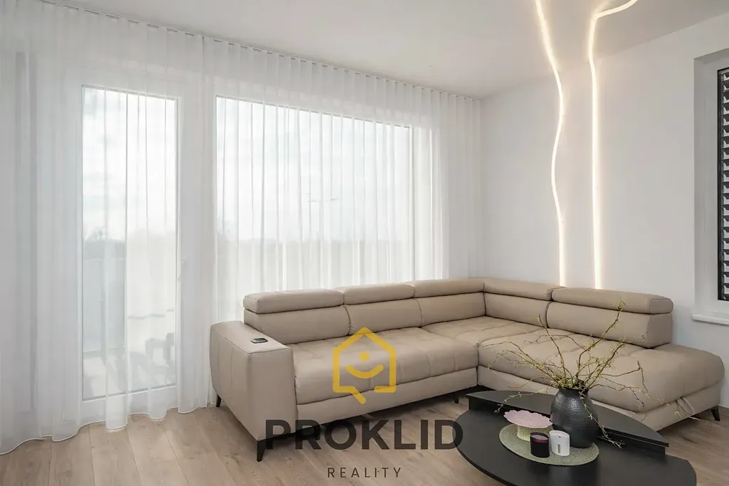 podlahové topení po celé ploše bytu, podlaha srovnaná nivelační hmotou – podlaha bez přechodových lišt, lepený zátěžový vinyl, př. klimatizace, venkovní stínící žaluzie, 2x výsuvná el.markýza, prakticky řešené zásuvky a vypínače (například větší počet zásuvek v kuchyni a v prostorném dětském pokoji, u kterého se do budoucna uvažovalo s rozdělením na 2 menší, tedy o dispozici 4+kk), posuvné skleněné dveře se skrytým pouzdrem do obývacího pokoje, dveře vyšší velikosti 210 cm, které mají zabudovaný zámek přímo v klikách, sprchový kout bez vaničky.