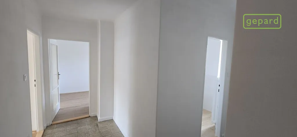 Dispozice: vstup, chodba, vpravo vestavná skříň, komora a koupelna se toaletou, sprchovacím koutem a umyvadlem. Dále se z chodby dostaneme vlevo do dvou samostatných pokojů, které jsou zároveň propojeny dveřmi a z jednoho z nich se dá ještě stejně jako z chodby vstoupit do kuchyně. Ta je vybavena novou kuchyňskou linkou s plynovým sporákem, digestoří a myčkou nádobí.