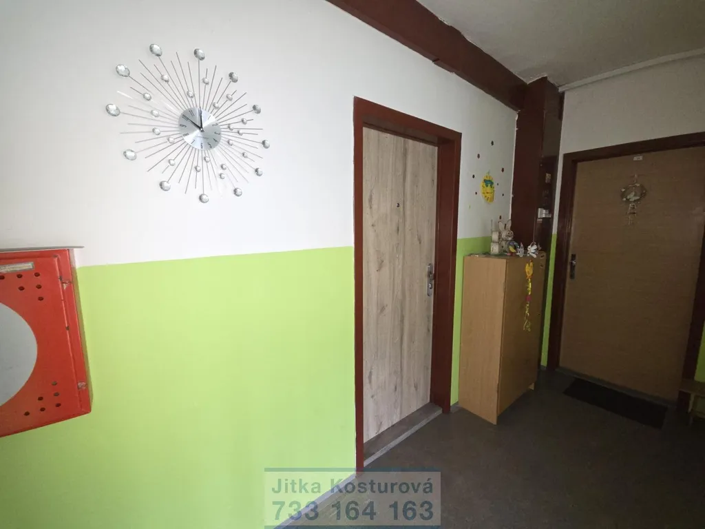 V bytě jsou plastová okna, nové podlahy, světla, dveře, obklady, dlažba, nové omítky. Sestává ze vstupní chodby s věšákovou stěnou a vestavěnými skříněmi, koupelny s WC, dvou obytných pokojů a kuchyně. Koupelna disponuje umyvadlem, sprchovým koutem, zrcadlem, skříňkou pod umyvadlem. V kuchyni se nachází nová kuchyňská linka se spotřebiči - sklokeramická varná deska, elektrická trouba a digestoř, přípojka na pračku a myčku. K dispozici je sklep, v domě kolárna a sušárna. Parkovat lze před domem. Vytápění je dálkové.