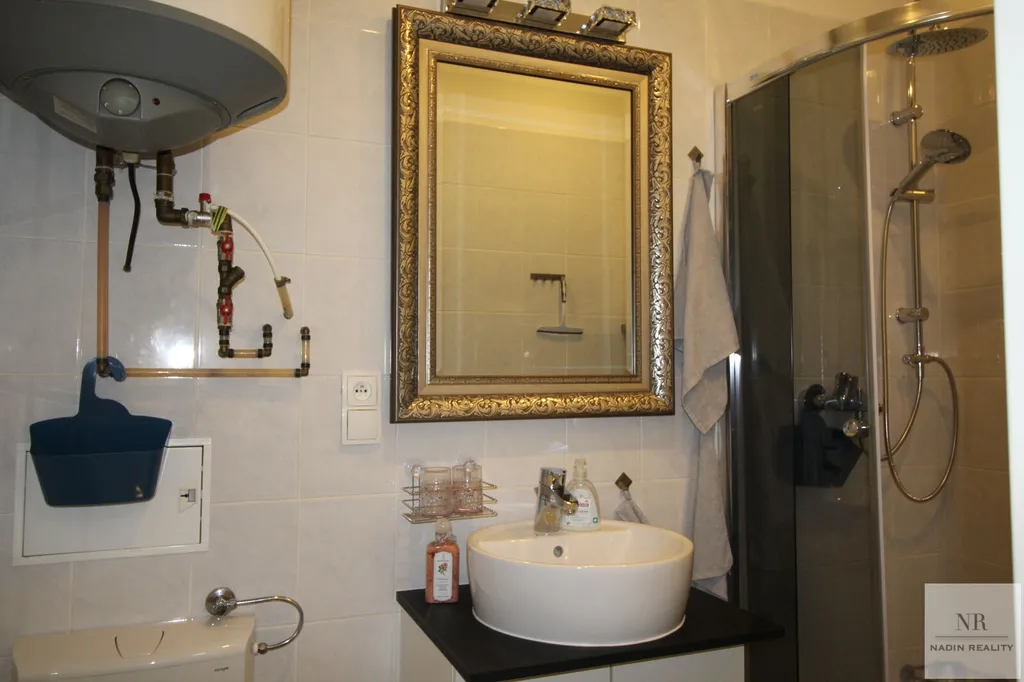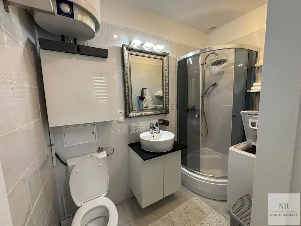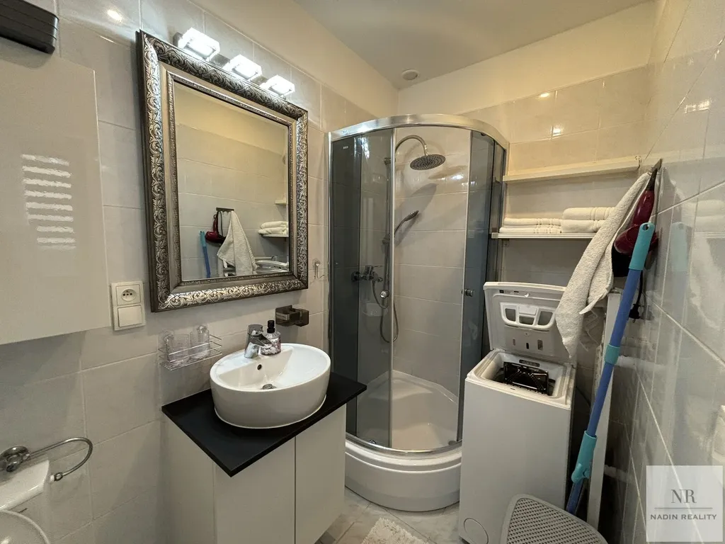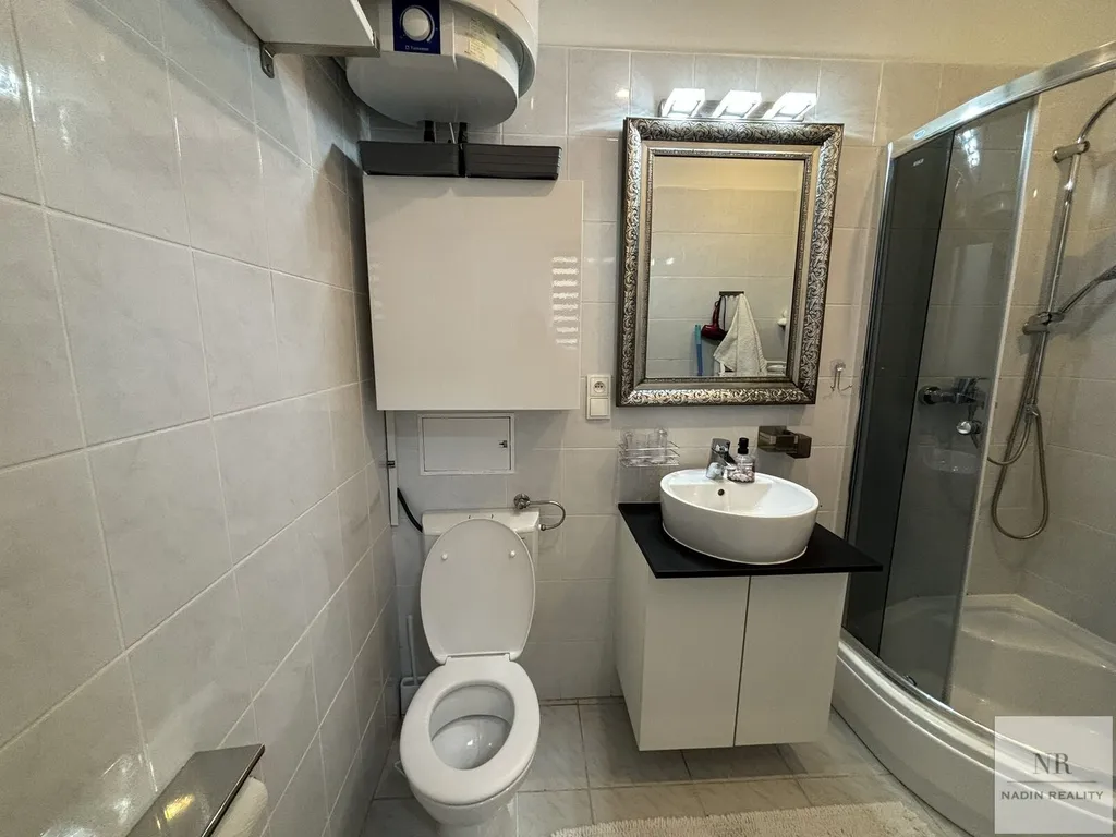 Koupelna je vybavena moderním sprchovým koutem a toaletou, stejně jako pračkou, což přispívá k pohodlí a funkčnosti bytu. Obývací pokoj nabízí prostor pro odpočinek a zábavu s rozkládacím gaučem, televizí a jídelním stolem, což vytváří příjemné domácí prostředí.