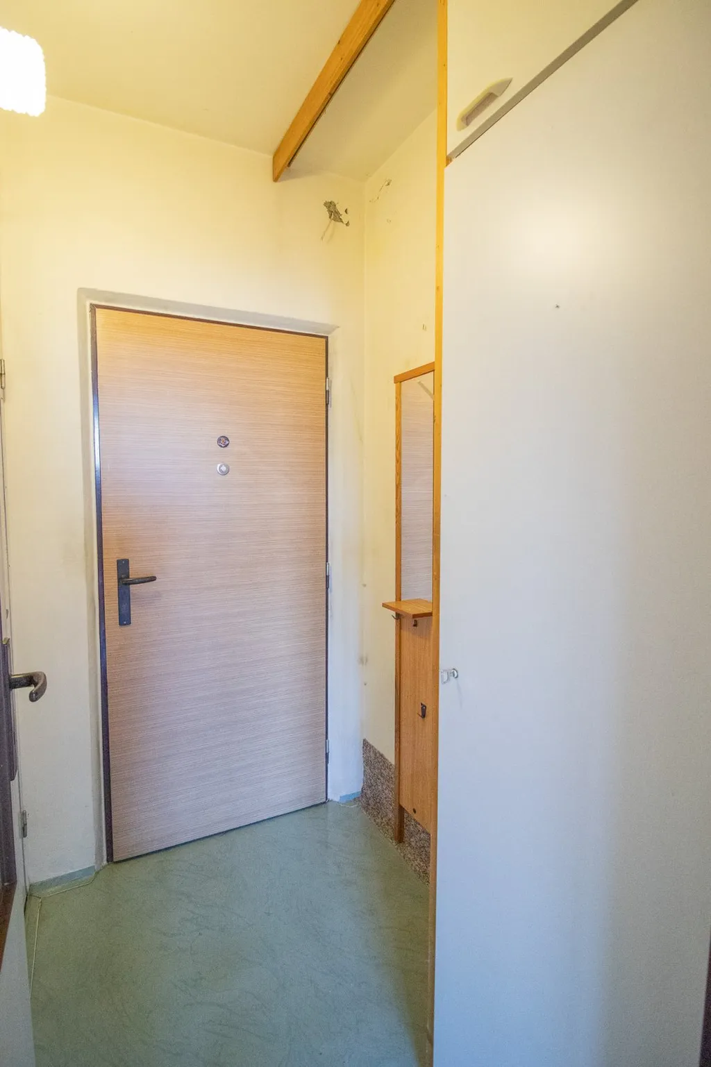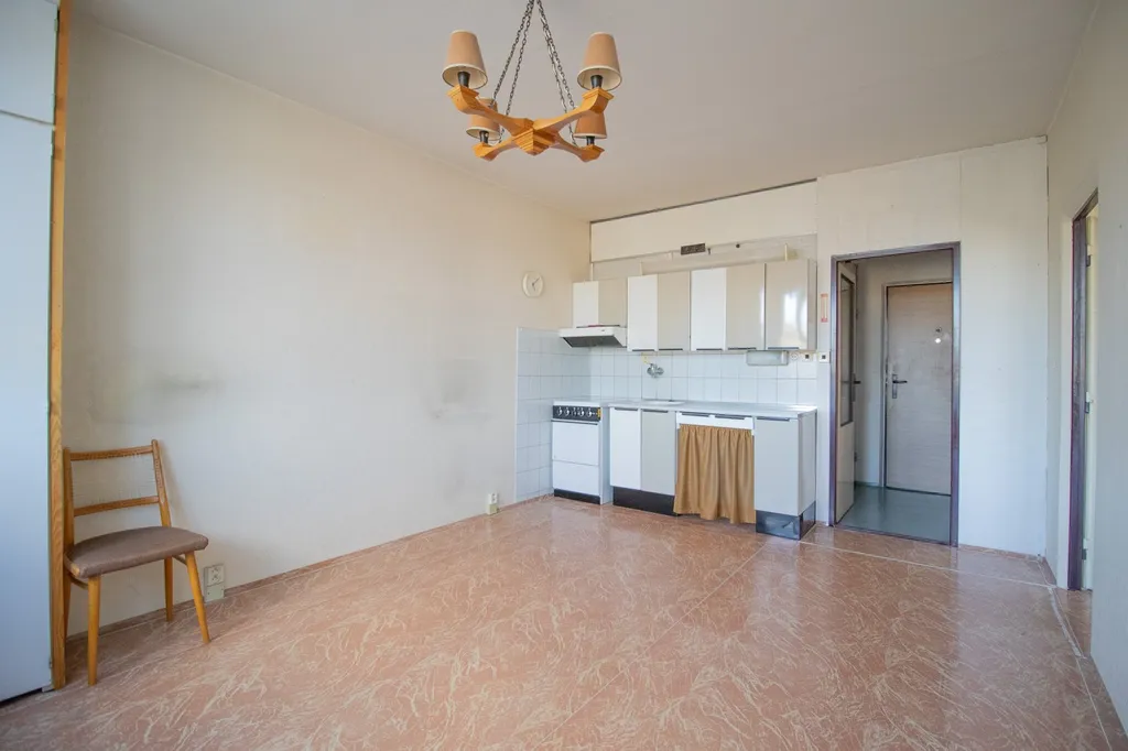 Vnitřní dispozice: Vstupní předsíň: s dostatkem místa pro šatní stěnu; kuchyně: vybavena starší linkou, plynovým sporákem. Prostorný pokoj. Obě prakticky řešené místnosti nabízejí klidné zázemí a prostor pro kreativní rekonstrukci. Koupelna v původním, udržovaném stavu (jádro) se sprchovou vanou, umyvadlem a WC – ideální prostor pro realizaci rekonstrukce dle vlastních představ. Okna již vyměněna za moderní plastová.
