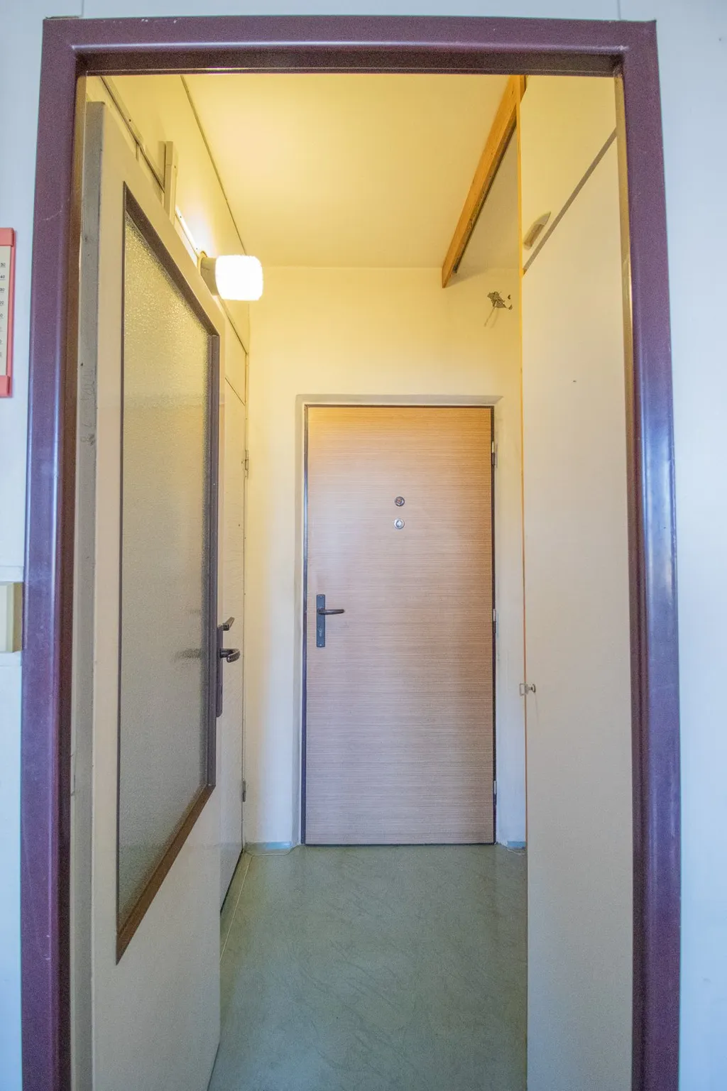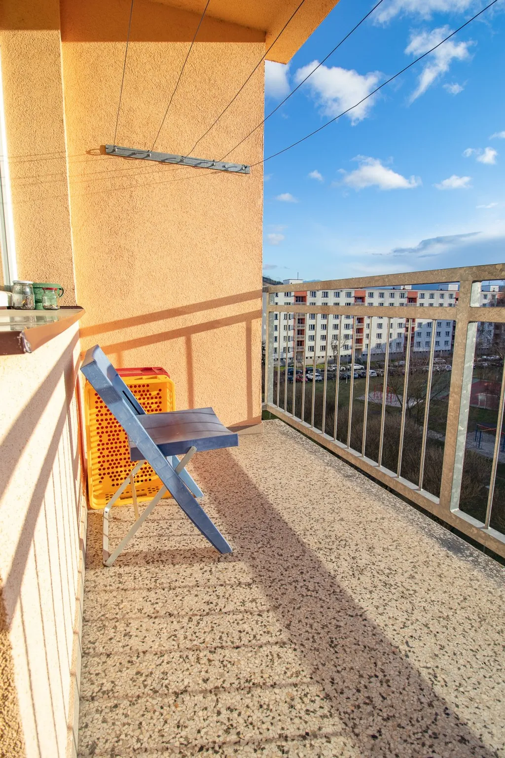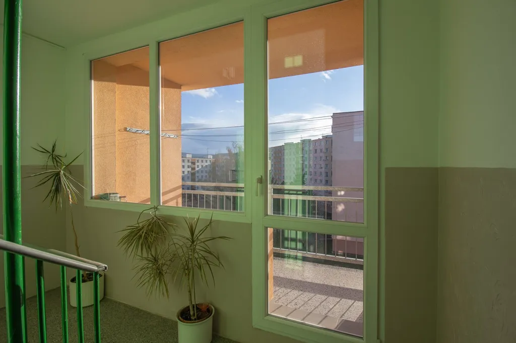Byt se nachází v 5. patře (ze 6. pater) revitalizovaného panelového domu s moderním výtahem. Díky své poloze a orientaci nabízí oba pokoje přímý výhled na kapli Anděla Strážce.