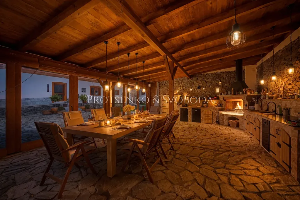 Atmosféru místa dotváří uzavřený dvůr, krásně upravené venkovní plochy, kamenné prvky, dřevo, velkorysá zahradní kuchyně, relaxační zóna i pečlivě vysazená zahrada s ovocnými stromy. Celý areál působí harmonicky, bezpečně a mimořádně reprezentativně. Je to místo, kde si umíte představit klidné rodinné ráno, letní večer s přáteli, firemní setkání i víkendový pobyt hostů, kteří sem přijedou za odpočinkem a zážitkem.