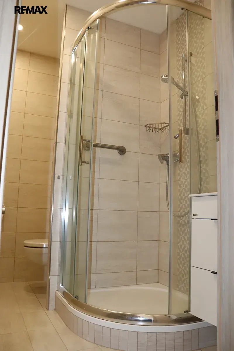 • Koupelna: Zděné jádro v nadčasovém designu se sprchovým koutem, toaletou a umyvadlovou skříňkou.
