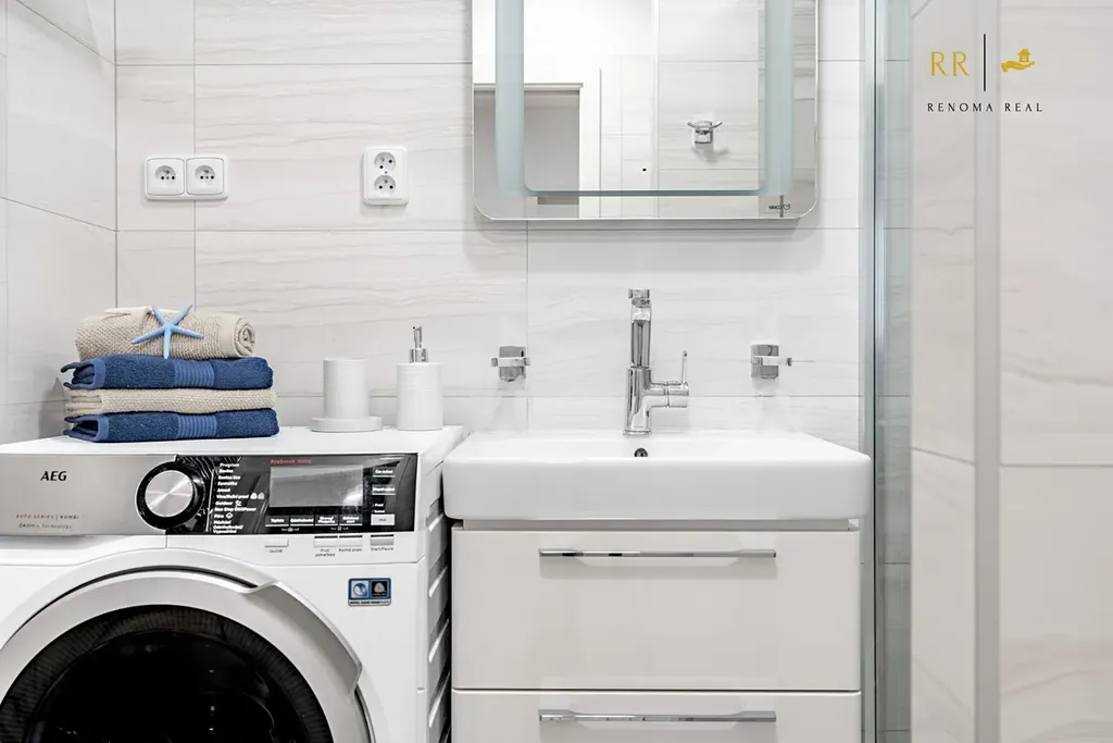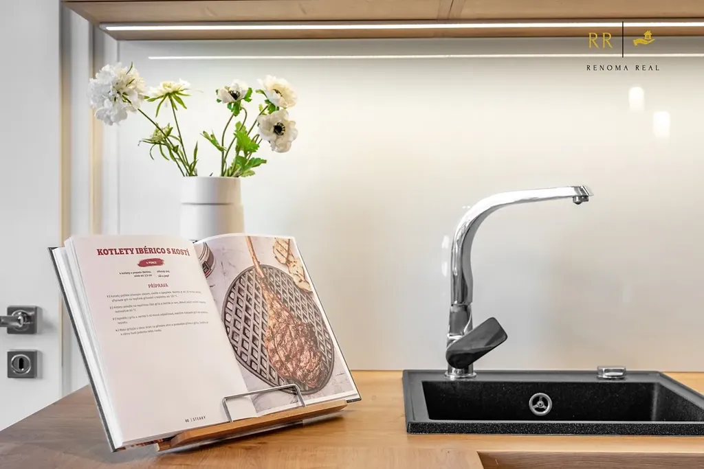 Rekonstrukce 2018 byla opravdu kompletní: nové rozvody elektřiny i vody, podlahy (včetně kročejové izolace) a finální povrchy, SDK podhledy, nové topení (radiátory i ležaté vedení), vestavěný nábytek na míru (kuchyň a úložné prostory).