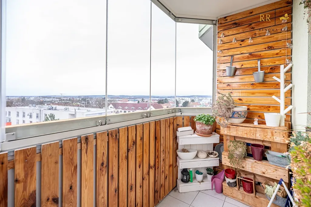 Byt je v předposledním patře domu v první řadě sídliště. JZ strana (pokoje a lodžie) nabízí otevřený výhled do starší zástavby Slatiny až na Pálavu, SV strana (obývací část) míří do zeleně.