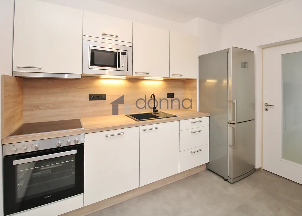 K dispozici kuchyňská linka, sporák, trouba, lednice, myčka, mikrovlnná trouba, vestavěné skříně, jinak bez nábytku.
