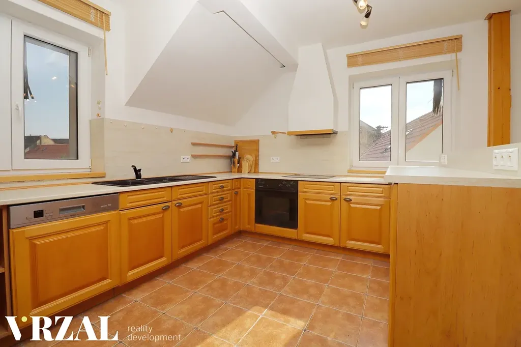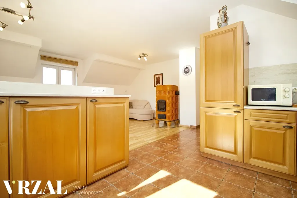 - Kuchyňská linka je plně vybavena kvalitními spotřebiči, na chodbě a v pokojích se nachází na míru vyrobené vestavné skříně.