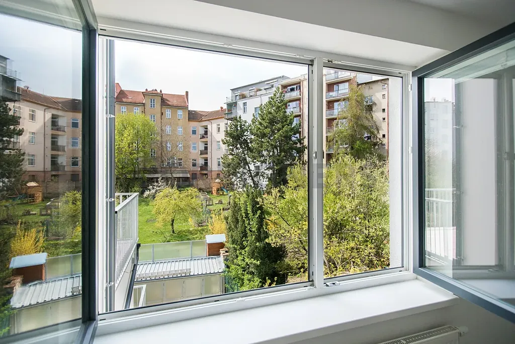 Orientace bytu: jeden pokoj do ulice Poděbradova, ostatní části do klidné zahrady.