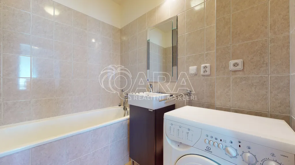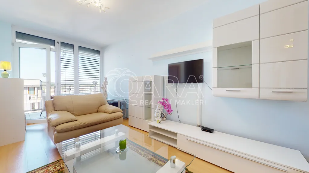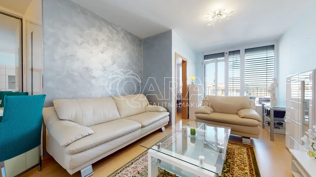 Byt je vybaven kompletně zařízením nábytkem, chybí jen pračka. Velká okna, která přináší spoustu světla, je možné odstínit venkovními žaluziemi.