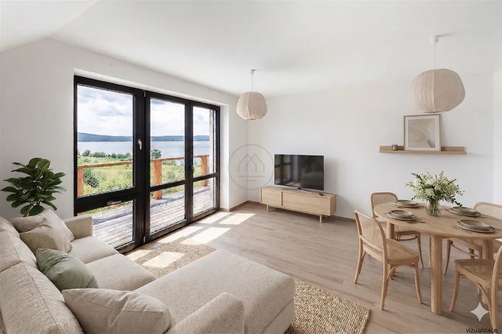 V ceně je zahrnuta kuchyňská linka, velkoformátové keramické obklady, dlažba a kompletní sanitární vybavení. K bytu lze dokoupit vlastní parkovací stání. Objekt je napojen na ČOV, vytápění a ohřev TUV zajišťuje úsporné tepelné čerpadlo. Okolí domu tvoří otevřená zahrada s přímým výhledem do zeleně a na vodu.