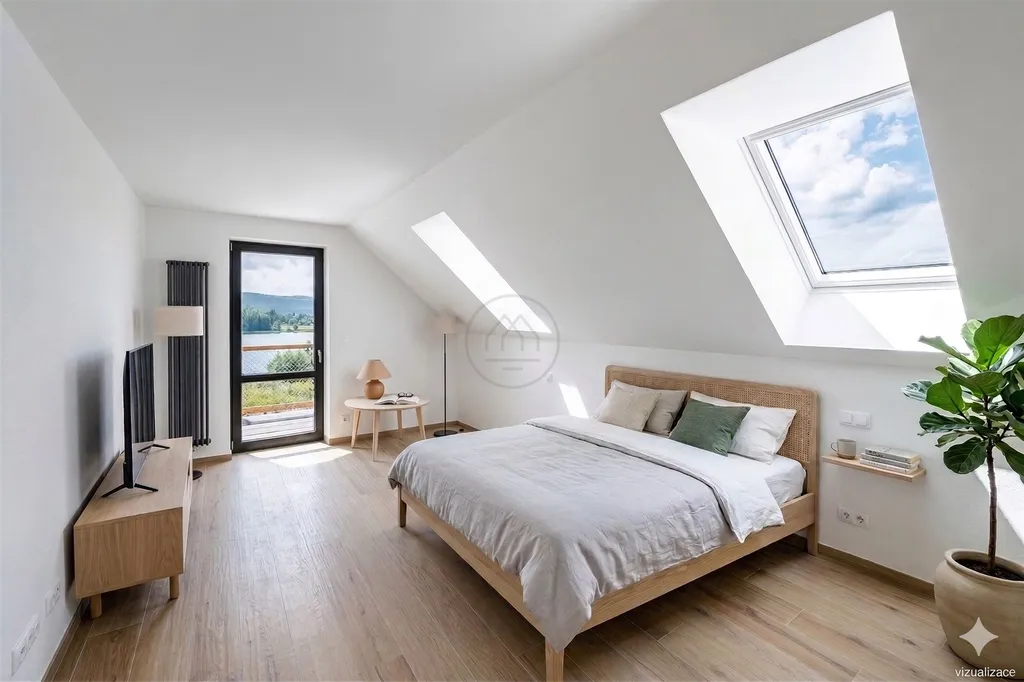 Podkrovní jednotka je promyšleně navržena a sestává ze zádveří, moderní koupelny s WC a prostorného obývacího pokoje s kuchyňským koutem. Hlavní dominantou je přímý vstup na balkon o rozloze 12,6 m², která nabízí dechberoucí panoramatický výhled na vodní hladinu. Dispozici doplňuje světlá ložnice a nadstandardně velká sklepní kóje v suterénu budovy.