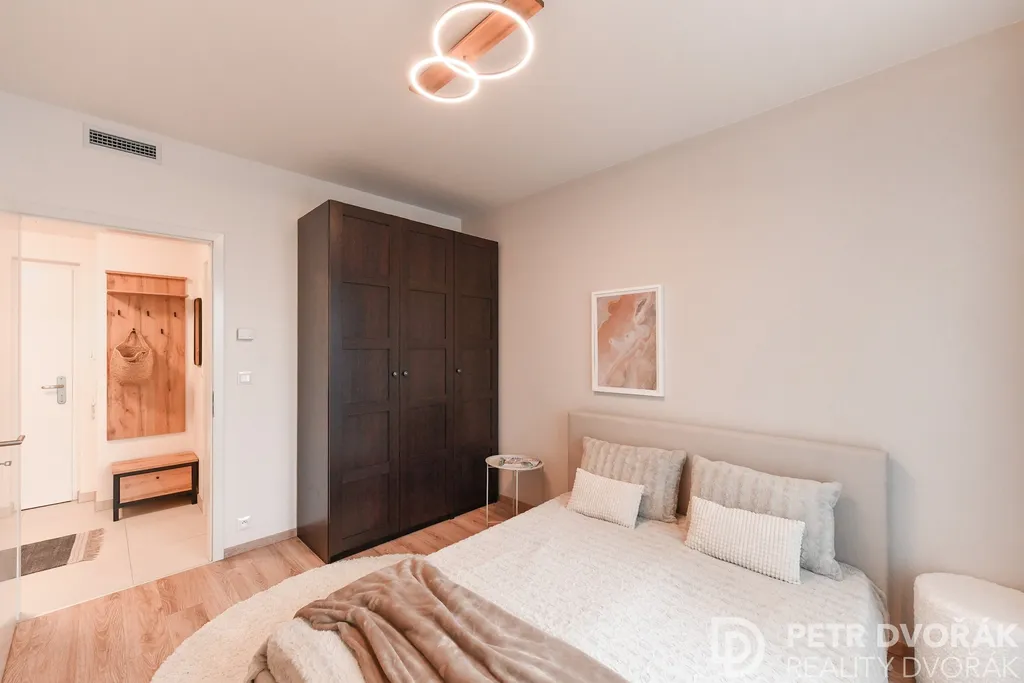 Dispozici 2+kk tvoří prosvětlený obývací pokoj s plně vybaveným kuchyňským koutem a navazující ložnice. Velkoformátová okna s izolačními trojskly a elektricky ovládanými exteriérovými žaluziemi zajišťují v interiéru příjemné klima po celý rok. Byt je vybaven systémem řízeného větrání s rekuperací tepla a inteligentním systémem Somfy TaHoma.