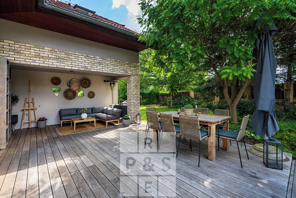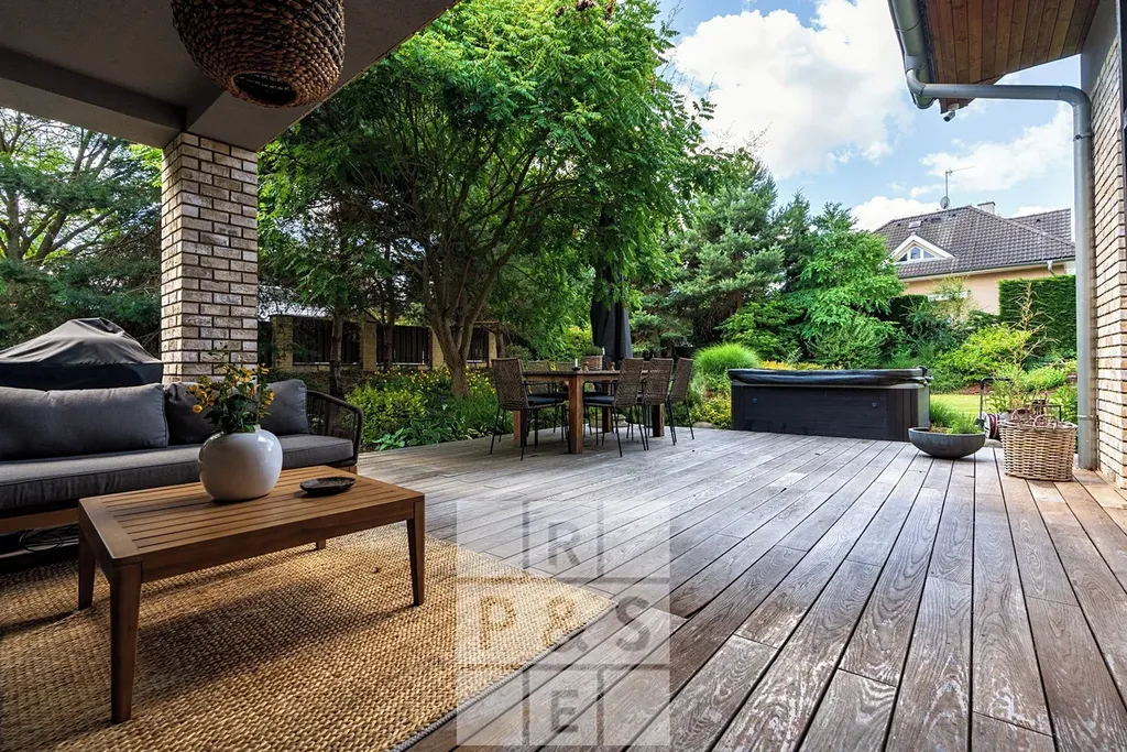 Na pečlivě udržované zahradě najdete klid a soukromí pod vzrostlými stromy, prostor pro relaxaci na 20m² terase i přípravu na venkovní vířivku.