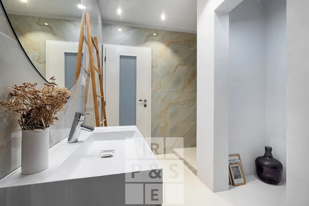 Dominantou domu je téměř 50m² velký, prosvětlený obývací pokoj s francouzskými okny, krbem a vstupem na velkou terasu. Kuchyňská linka s kamennou pracovní deskou, plně vybavená spotřebiči, navazuje na komfortní jídelní kout. Nechybí tři koupelny, velkorysá šatna, domácí kino ani pokoje s balkonem. V domě jsou dřevěné podlahy a schodiště, podlahové vytápění doplněné krbem zajišťuje tepelný komfort po celý rok. Vytápění zajišťuje plynový kotel, elektroinstalace 230 V a 3 fáze s jističem 25 A.