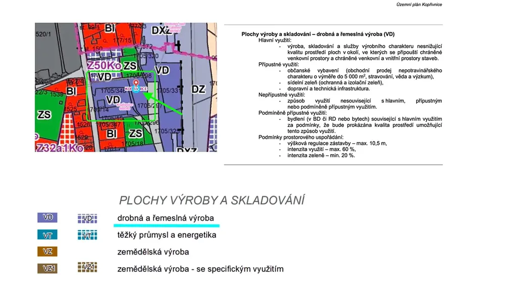 Územní plán: Pozemek je zařazen v kategorii Plochy výroby a skladování, což umožňuje široké