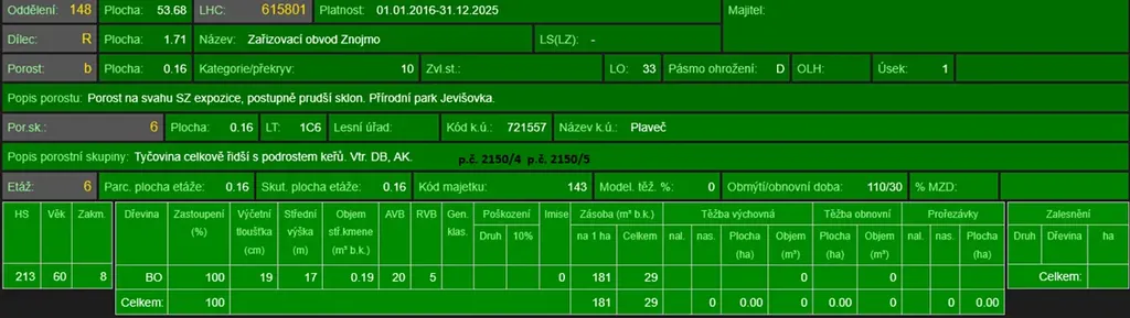 - p.č. 2150/5 vedená jako lesní pozemek o celkové výměře 606 m2 (stáří lesa 70 let - zastoupení dřevin borovice).