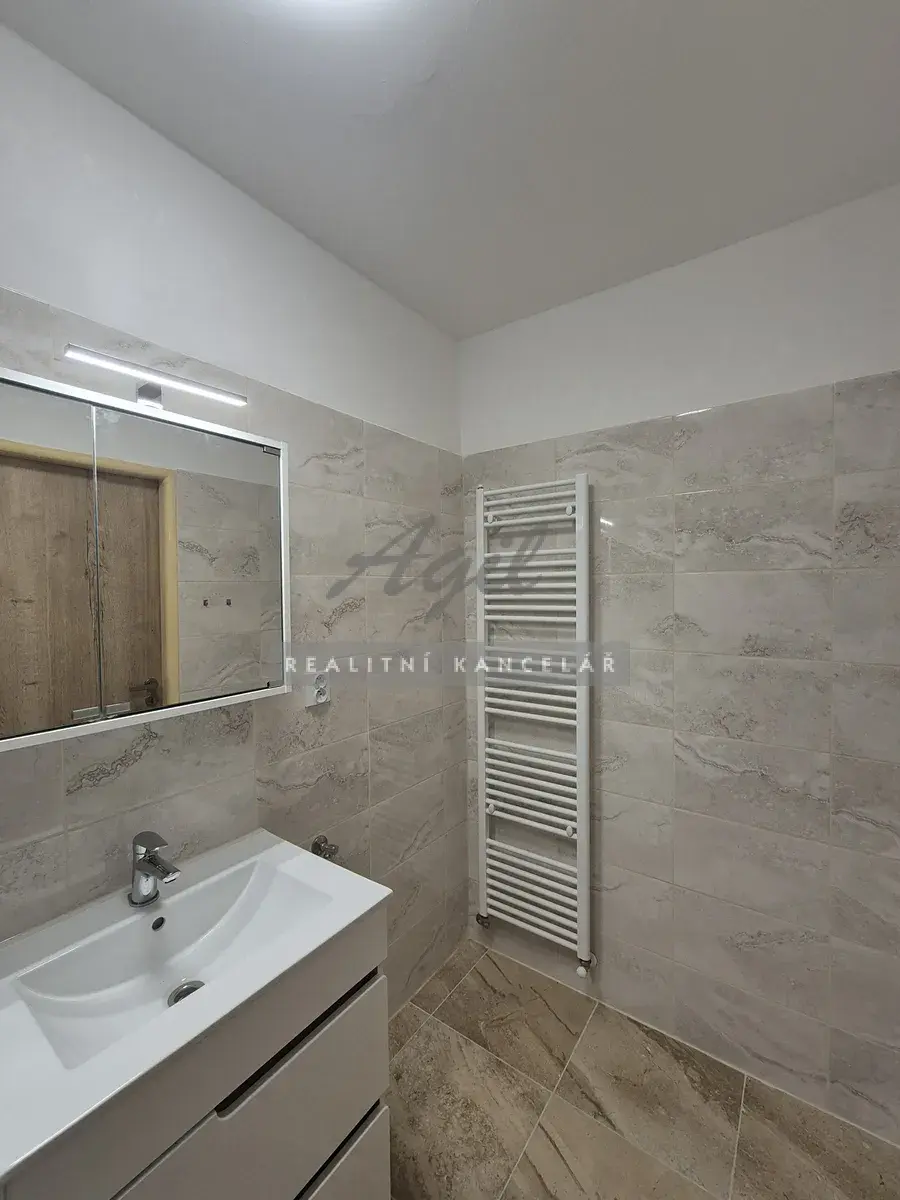 Koupelna – umyvadlo se spodní skříňkou, nástěnná zrcadlová skříňka s osvětlením, sprchový kout se skleněnou zástěnou, přípojka na pračku, otopný žebřík.