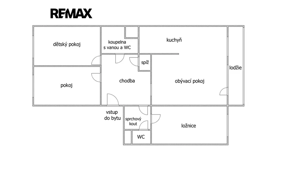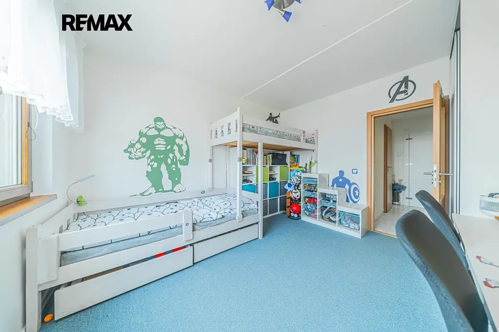 Dispozice bytu: prostorná vstupní chodba, dětský pokoj, pokoj, hlavní koupelna s vanou spojená s WC, spíž, obývací pokoj se vstupem na lodžii s posuvným zasklením, kuchyň, ložnice, druhá koupelna se sprchovým koutem a druhé samostatné WC.