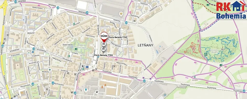 - Doprava: Zastávka MHD Staré Letňany jen 170 m od domu. Metro C - Letňany je jednoduše dostupné (cca 1,9 km), což zajišťuje rychlé spojení do centra.